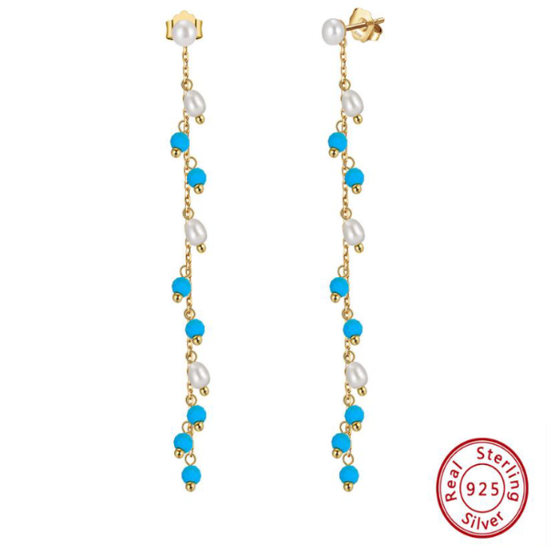 עגילי פנינים טבעיות ארוכים עם חרוזי טורקיז על בסיס כסף סטרלינג 925 מצופה זהב . באורך 69 מ"מ, מעניקים מראה אלגנטי ומרהיב לכל הופעה.