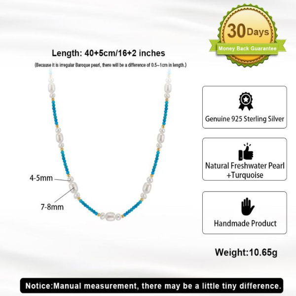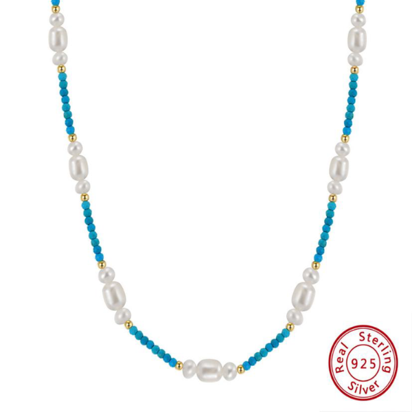 שרשרת פנינים טבעיות עם חרוזי טורקיז על בסיס כסף סטרלינג 925 מצופה זהב . באורך 43+5 ס"מ (18+2 אינץ'), מוסיפה מגע של אלגנטיות וזוהר לכל הופעה.